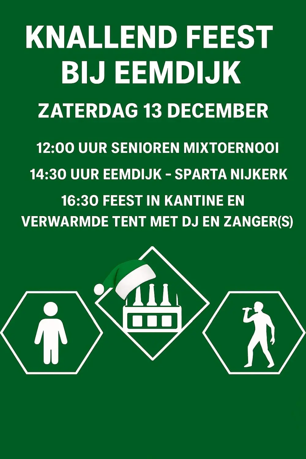 Terwijl de uitgenodigde seniorenteams na de wedstrijd genieten van een hapje en drankje van de club knalt ondertussen de muziek van de dj en zanger uit de speakers in de verwarmde tent voor iedereen. Dieks groen, maar zeker ook Spartaans oranje, voel je welkom bij Eemdijk en blijf wat langer dan gepland š„³